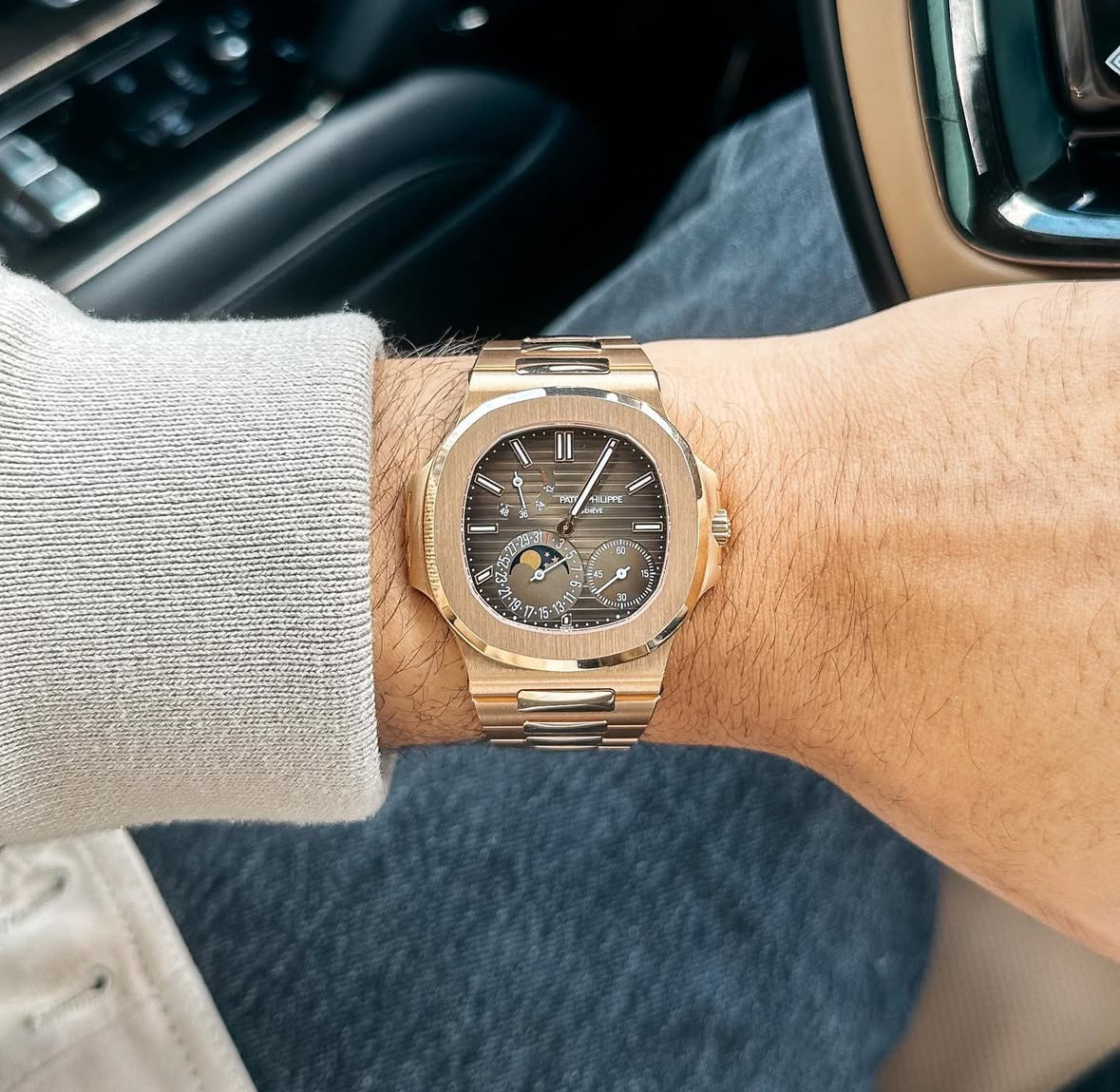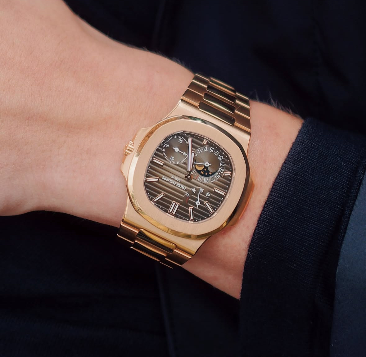 表盘材质:棕色日辉纹表盘,边缘呈黑色渐变效果,水平横纹浮雕图案,覆荧光涂层的金质立体时标、金质时针和分针,覆荧光涂层玫瑰金巴顿式圆头指针