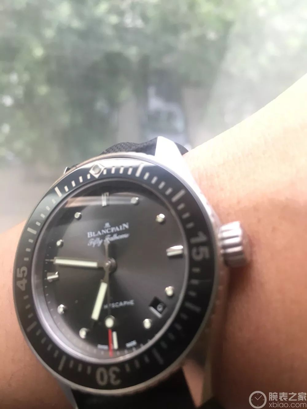 刚刚入完劳力士114300,又开始蠢蠢欲动了。最近几年非常流行潜水表,跑过专柜试过水鬼,43的五十噚,都无法驾驭,只因本人手腕比较细,苦逼啊,在宝珀上海专柜试表的时候店员告诉我有一款38的应该适合你,我喜出望外,最后又说可惜没货,又掉入冰底。 离开了专柜,还是心心念念店员所说的话,随后微信联系,对方说可以帮忙问问,一天后答复我,可以订货,2个月左右,对于我这种急性子来说简直是灭顶之灾啊,而且也有顾虑,毕竟没上过手,不知道效果如何。 就这么过去了一个礼拜,说巧真是巧,业务上需要给客户送礼,对方指定的竟然也是这款礼物,不过是蓝色的,这回好了,我得找两块了,通过各个朋友找,终于功夫不负有心人,在香港的一个角落找到一款蓝色的,三天后朋友带回来,上手了一下(忘了拍照了,晕)这回彻底种草了,真适合我啊。 表送出去了,我的欲望更强了,又托全世界的朋友找,一周下来回复只有大表盘的,这回郁闷了,正当准备放弃之时,有个朋友找到现货,二话不说直接预定,感谢朋友看我的流水账,下面上图