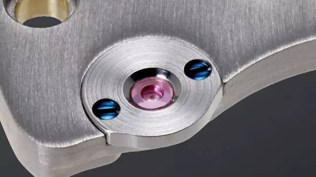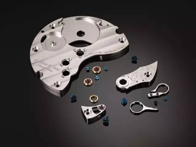 首先映入眼帘的就是经典的3/4夹板。与传统的格拉苏蒂夹板类似,莫勒的3/4夹板也覆盖了弹簧条盒轮、表冠以及整个齿轮传动系统。不同的是,莫勒还有一块可移动的擒纵轮夹板,方便擒纵轮和擒纵系统可以更加容易地被移动和清洗。在RMK 01上还能清楚看到3个美丽的黄金套筒,每个黄金套筒都配有3颗单独的蓝钢螺丝固定,与里面的红宝石一起,在夹板上显得熠熠生辉。更值得关注的,还有莫勒拥有独家专利技术的“啄木鸟微调装置”