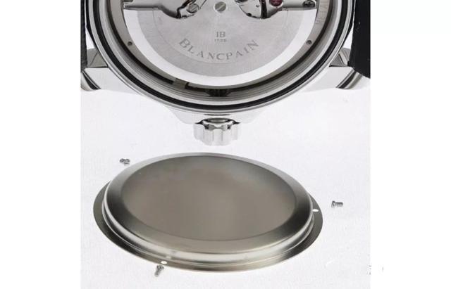 打开底盖后我们会看见1315机芯,1315是宝珀的一大主力机芯,基本参数如下:尺寸30.6毫米,厚5.65毫米,35个宝石轴承,227个零件,摆频28800次/时,动力120小时(5天长动力)。