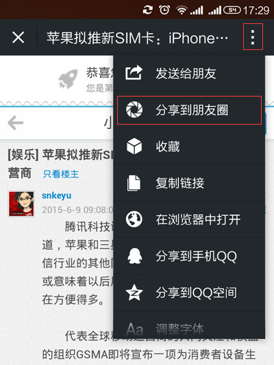 手机穿越看帖分享朋友圈就是这么简单
